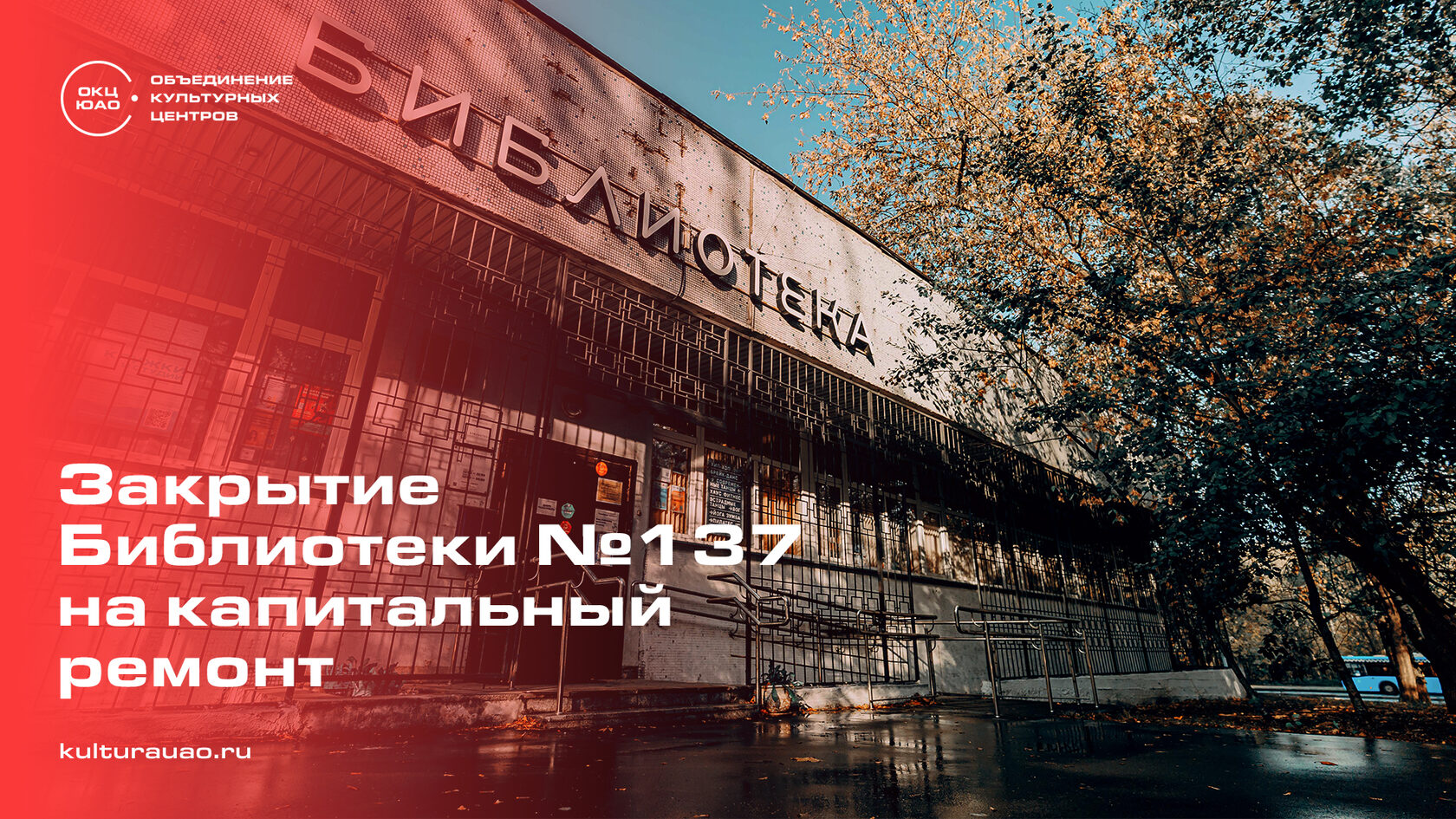 Дорогие читатели, сообщаем вам, что с 10 сентября на капитальный ремонт закрылась Библиотека №137, которая находится по адресу: ул. Липецкая, д.10, к.1, стр.3. Мы понимаем, что это может доставить неудобства, но данный ремонт очень важен для библиотеки.