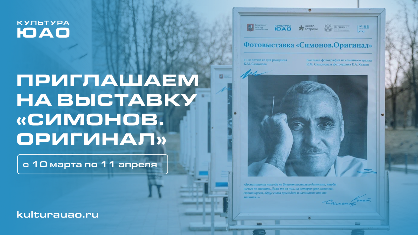 10 марта в Москве открылась фотовыставка «Симонов. Оригинал», организованная ОКЦ ЮАО и посвящённая жизни и творчеству к 110-летию со дня рождения выдающегося поэта, прозаика, драматурга и военного корреспондента Константина Симонова.
